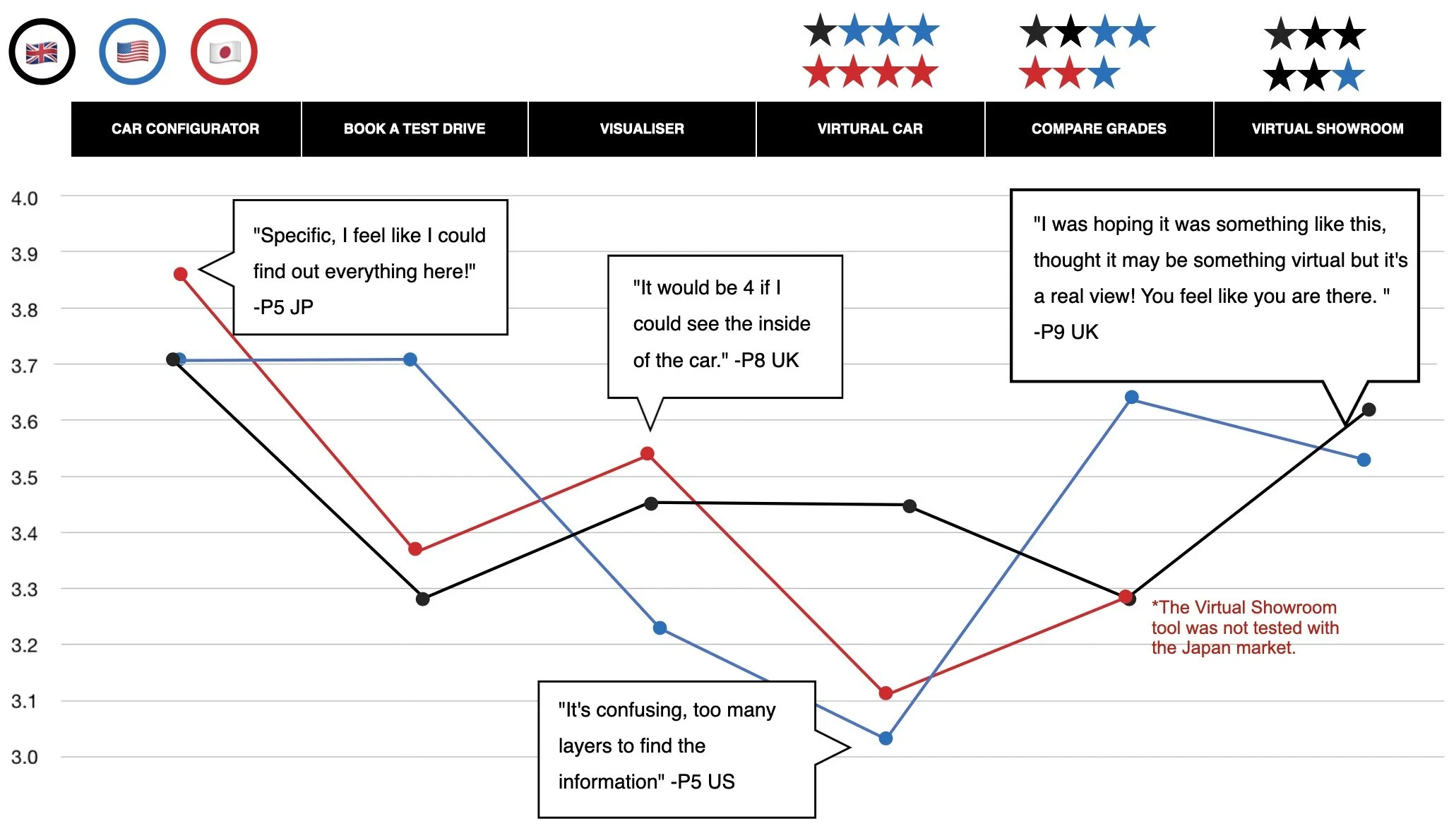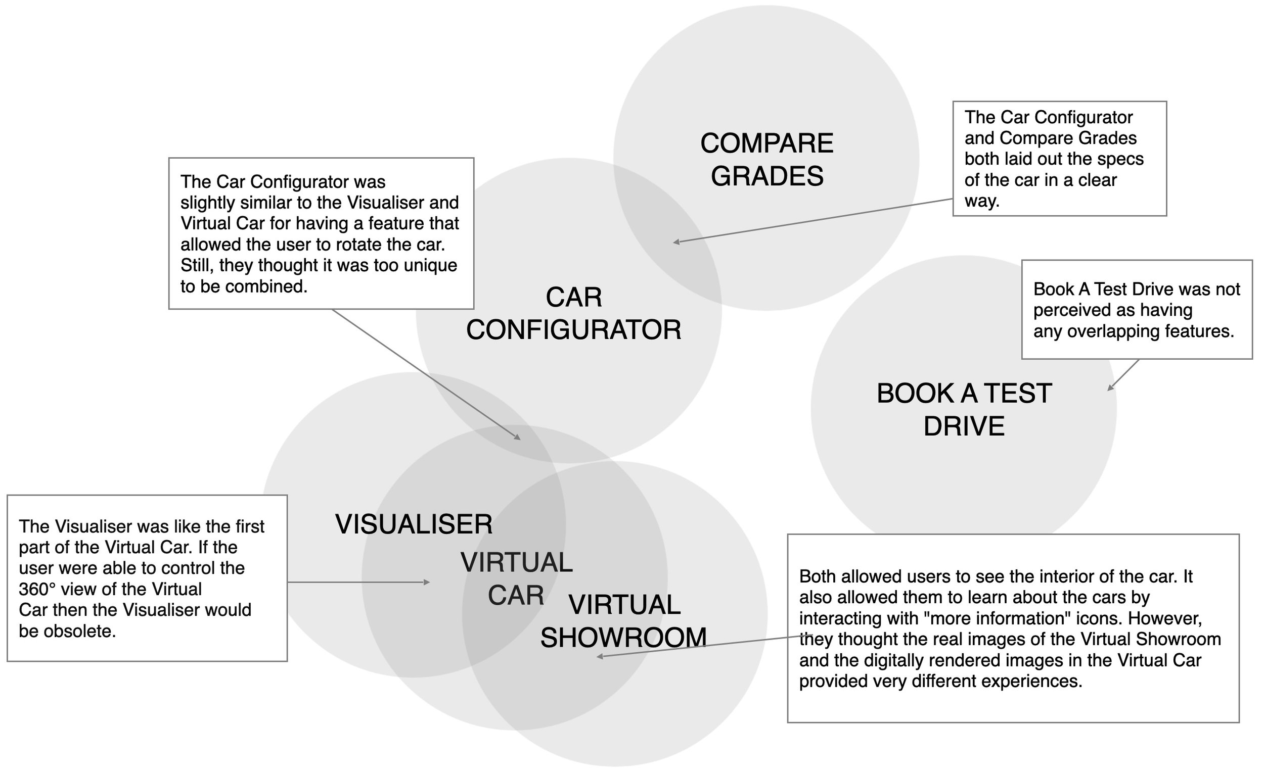 Experiencing the Virtual Car caused the most frustration. This was primarily due to the confusing information architecture and overall navigation of the tool. However, it was still seen as a critical part of the journey as it provided internal views of the vehicle with information about the features and benefits.