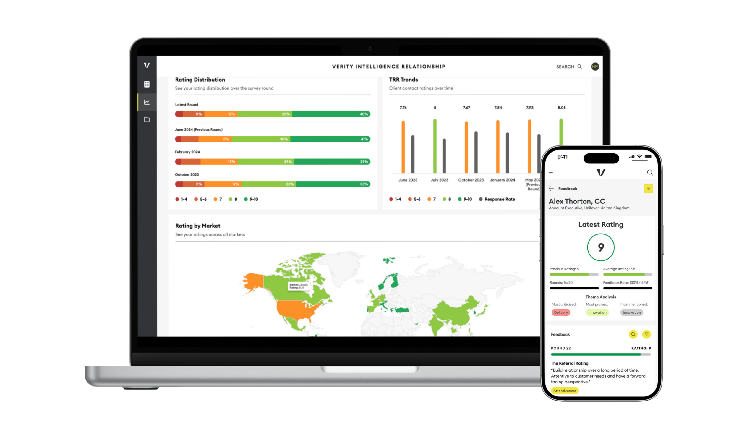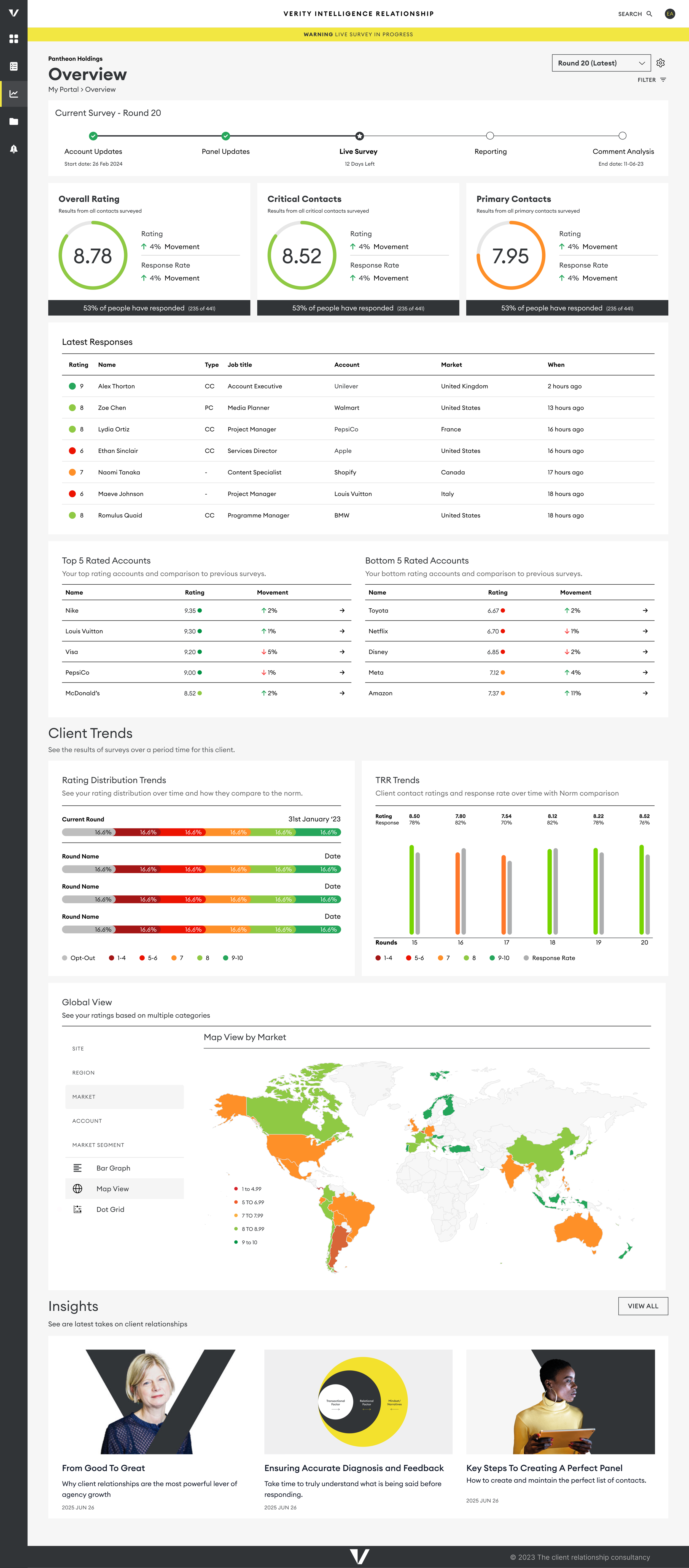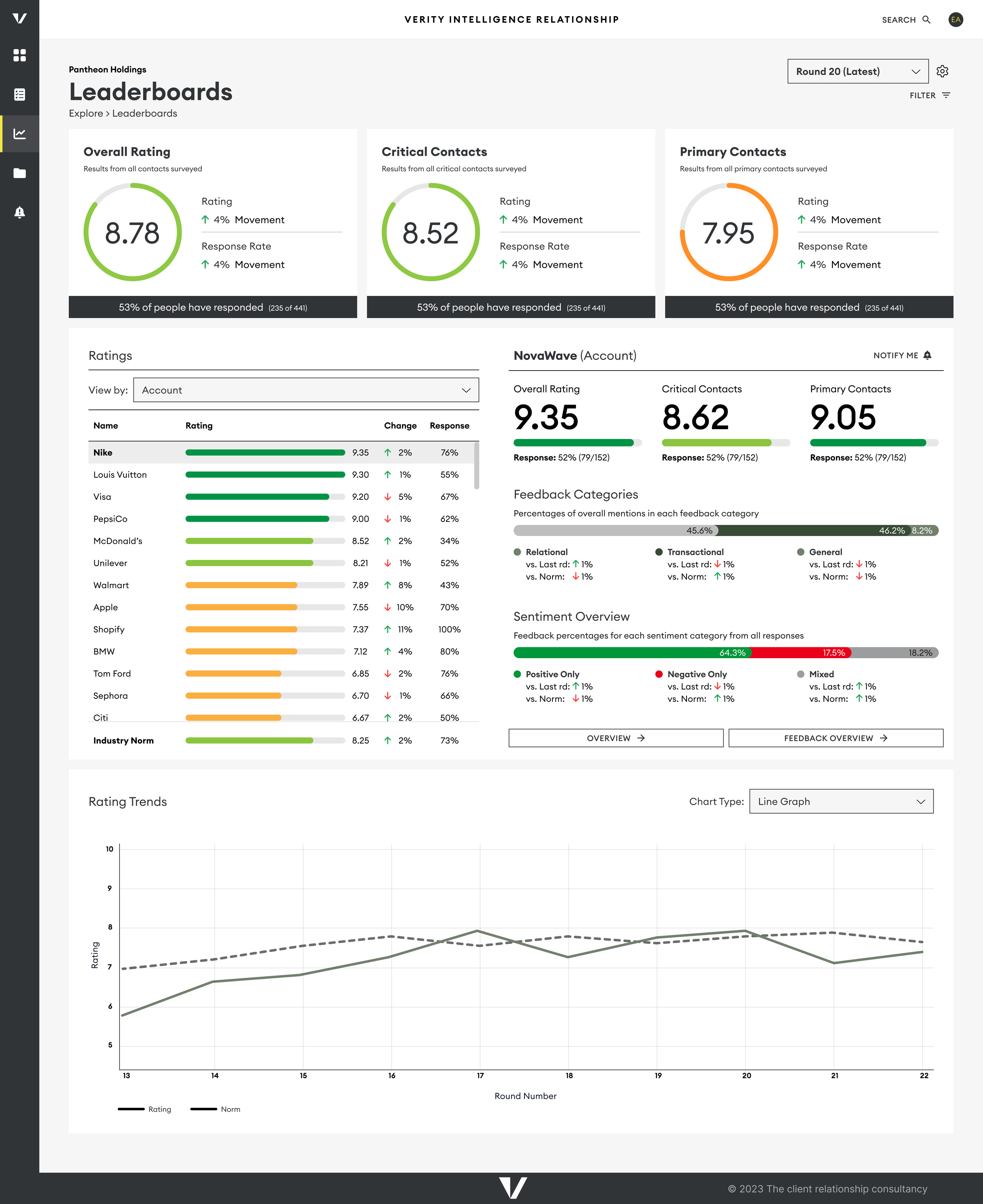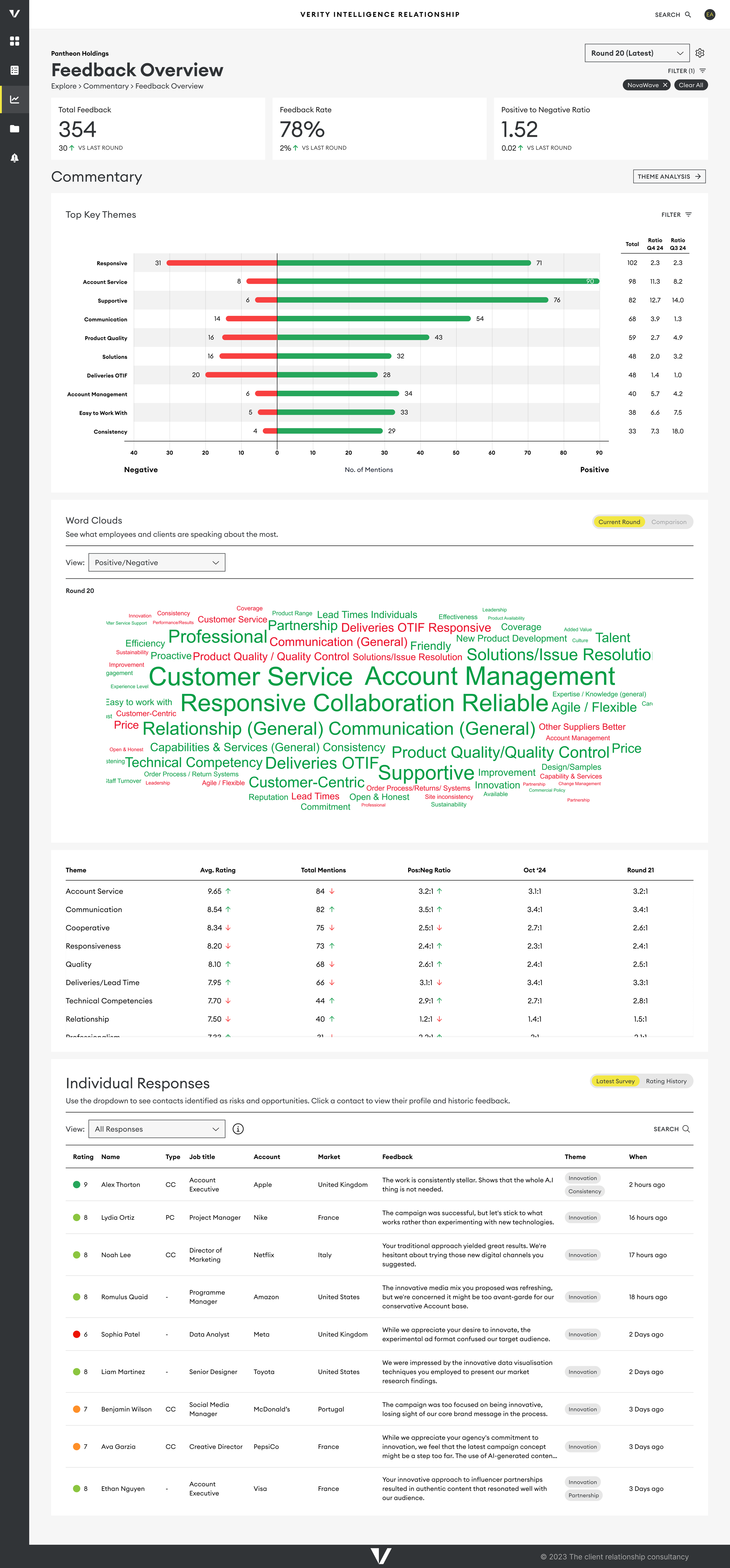 Verity Relationship Intelligence helps B2B companies manage their client relationships by regularly sending out client feedback surveys. These surveys provide insights into how their business relationships are performing, allowing them to compare results to historical and benchmark data.