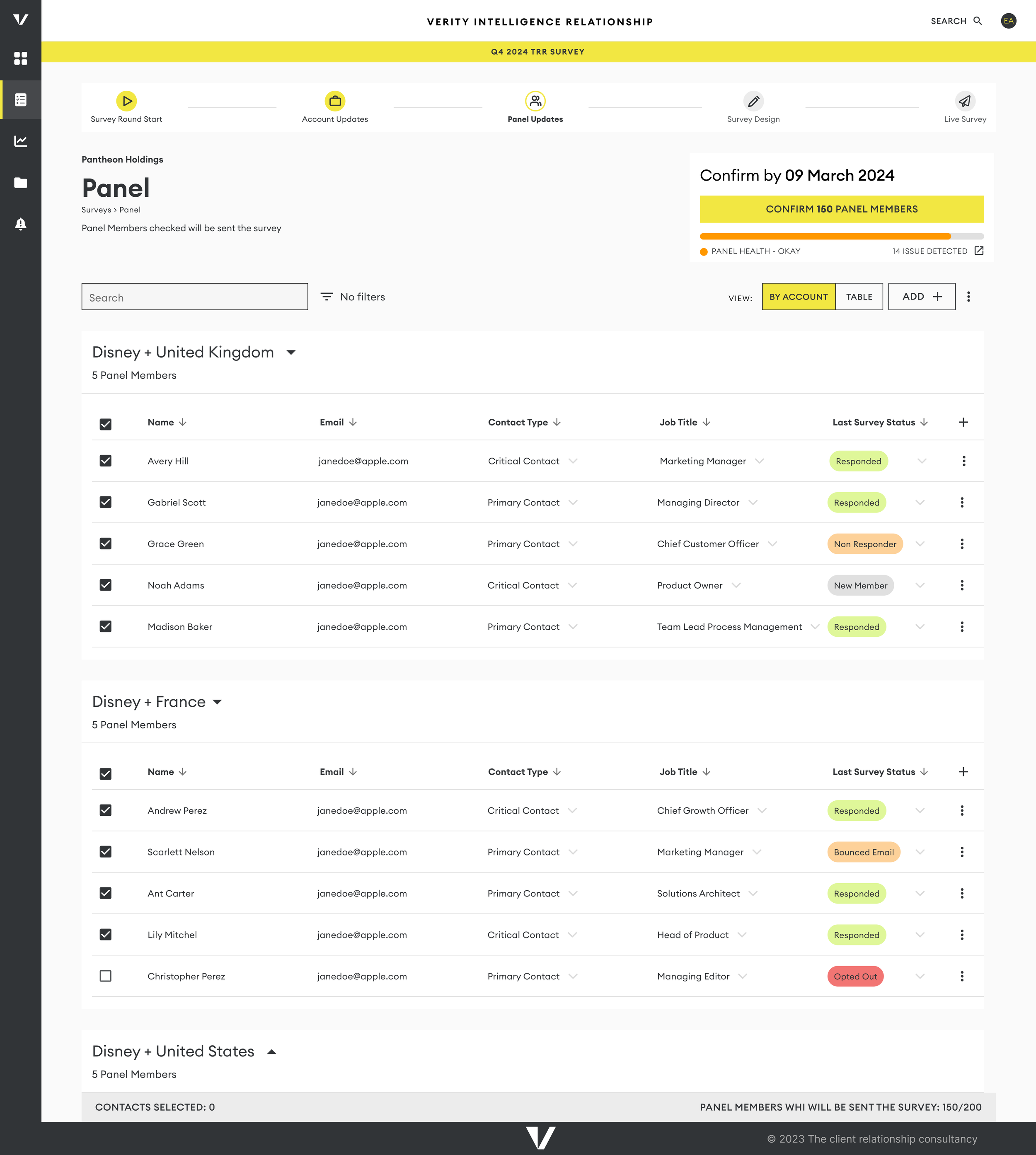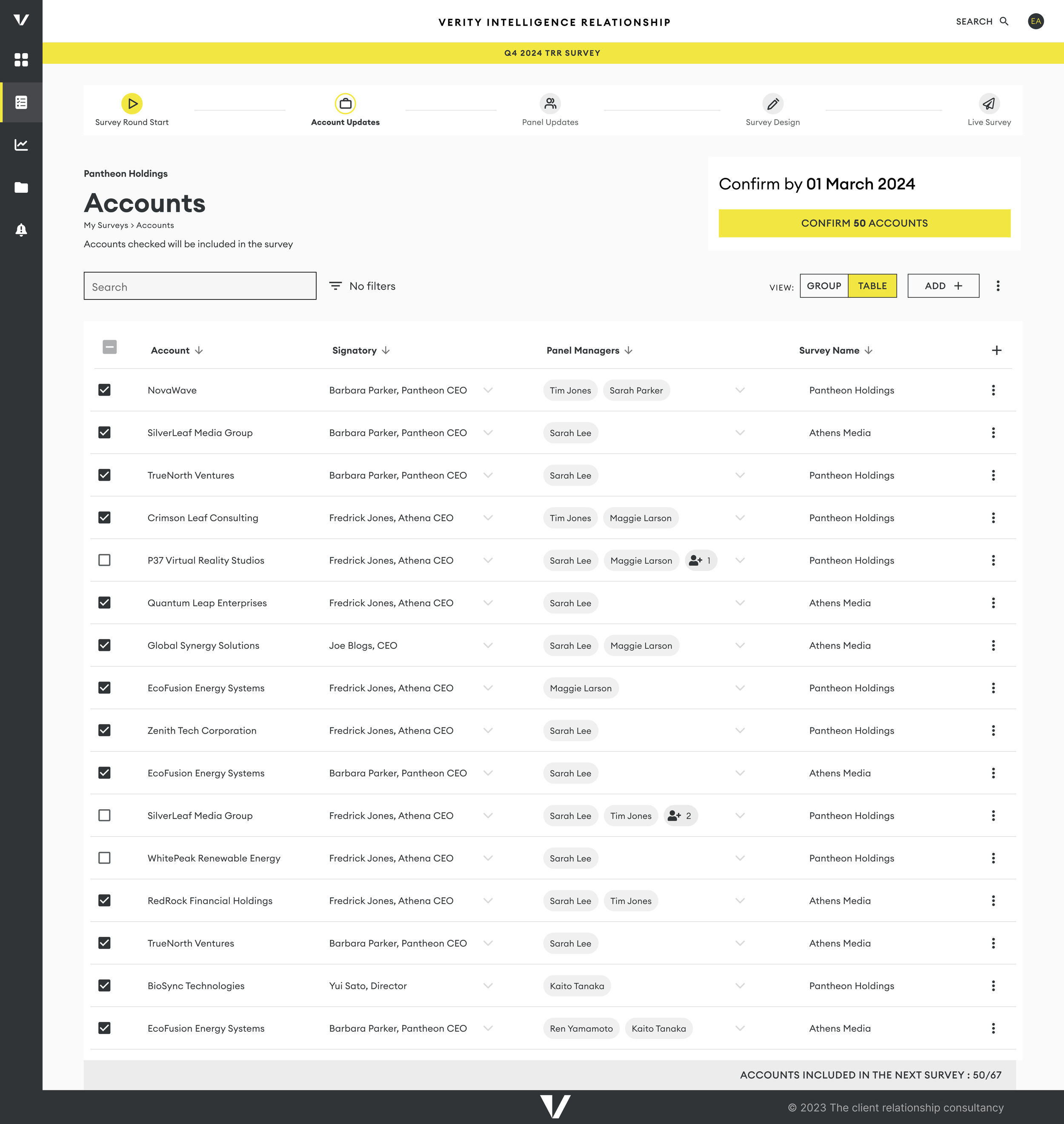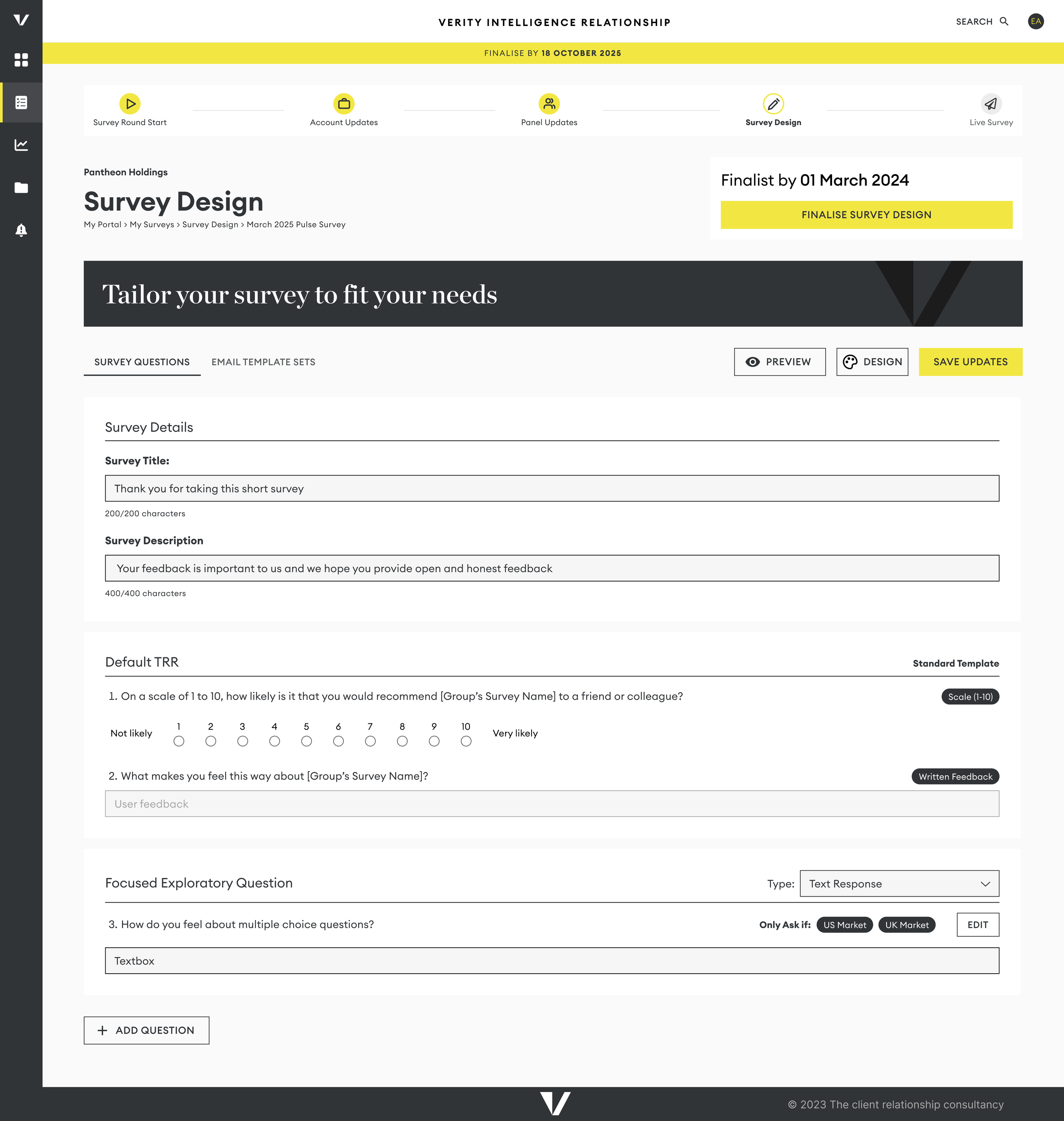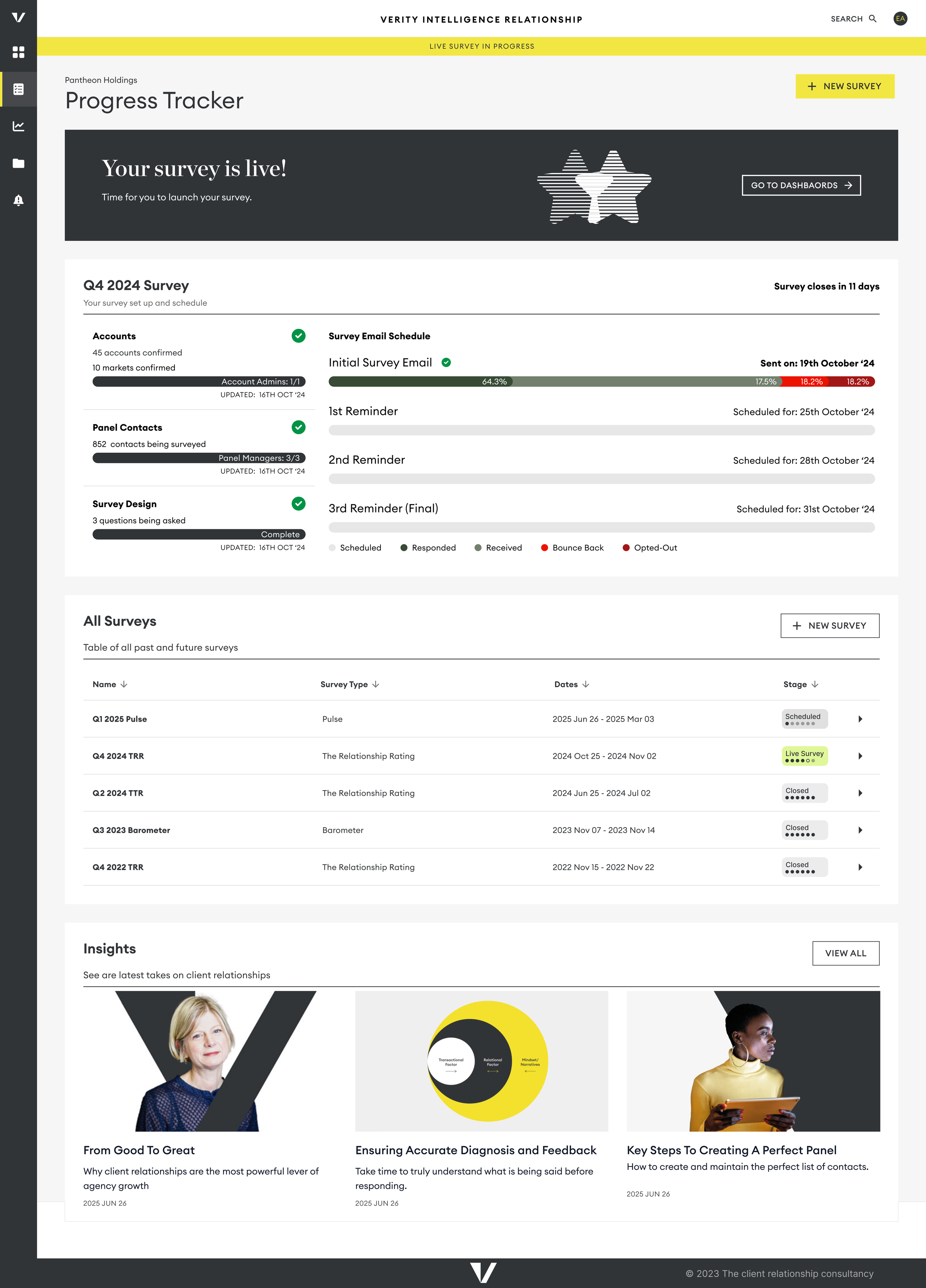 Verity Relationship Intelligence helps B2B companies manage their client relationships by regularly sending out client feedback surveys. These surveys provide insights into how their business relationships are performing, allowing them to compare results to historical and benchmark data.
