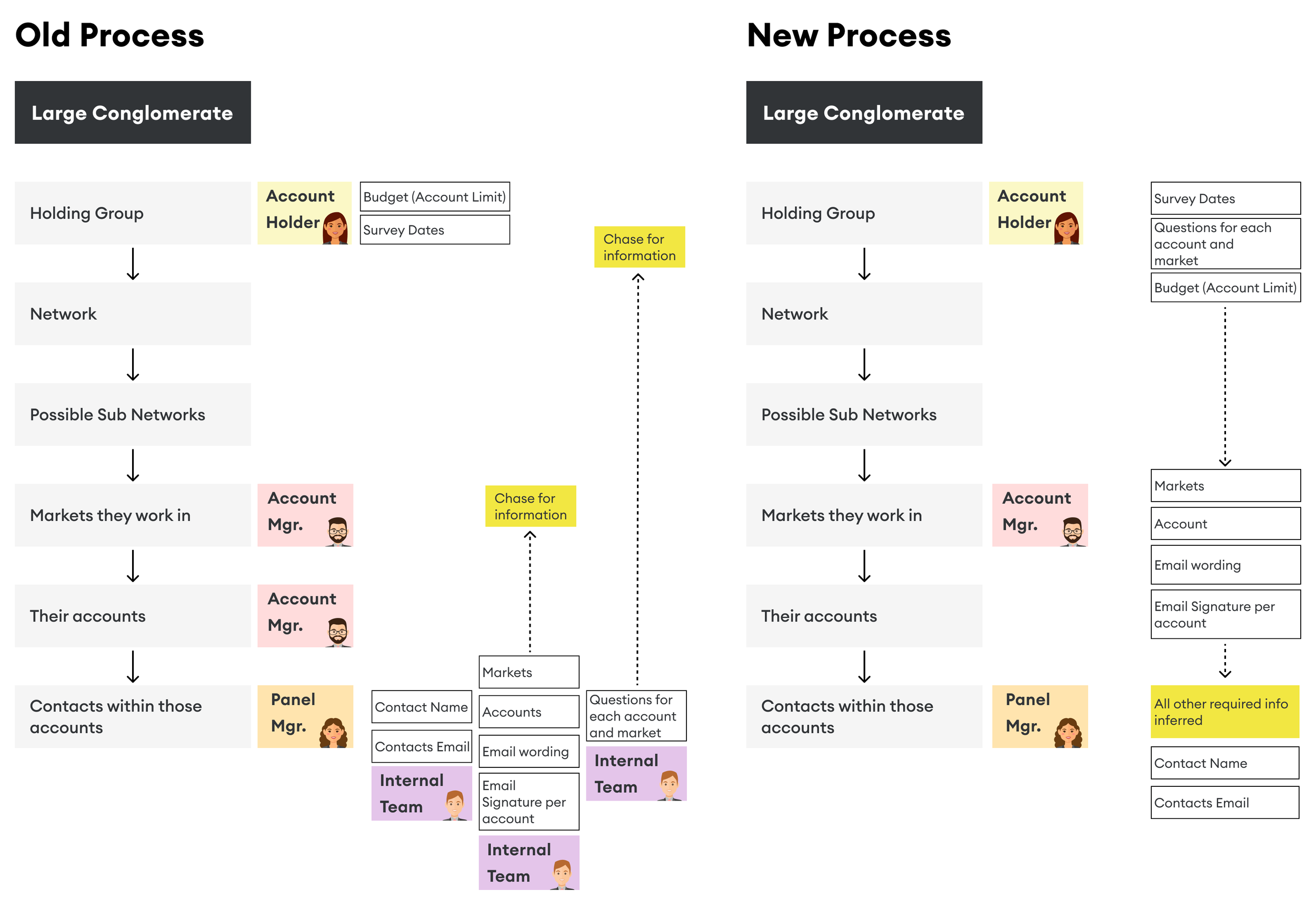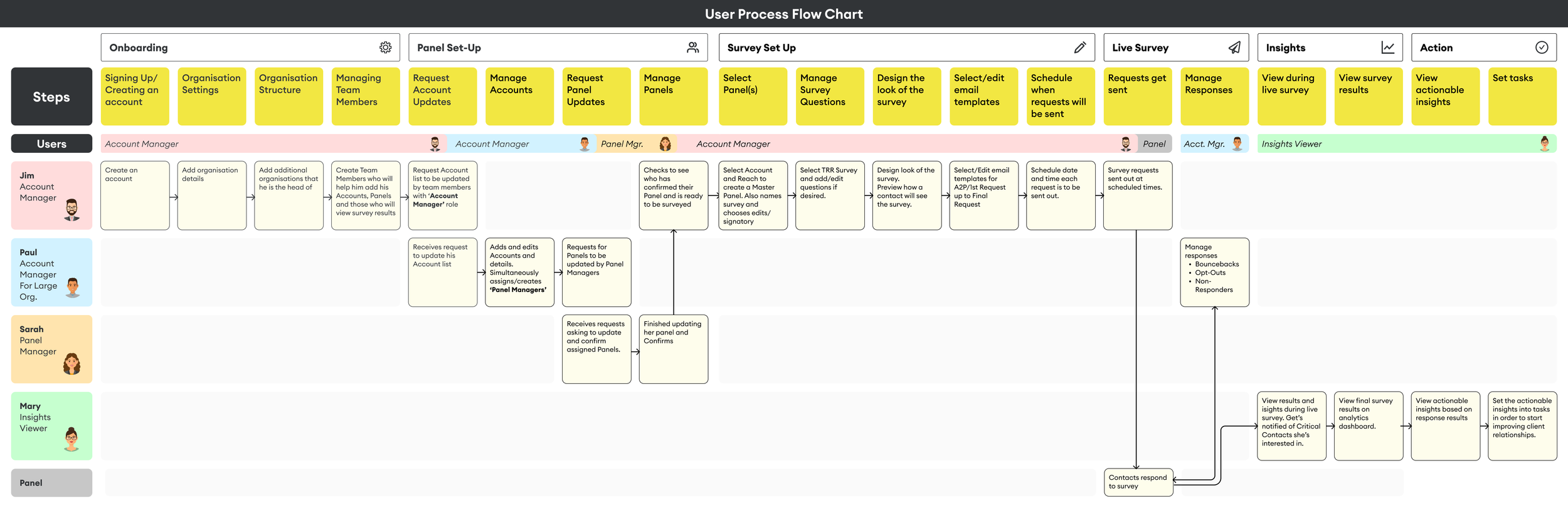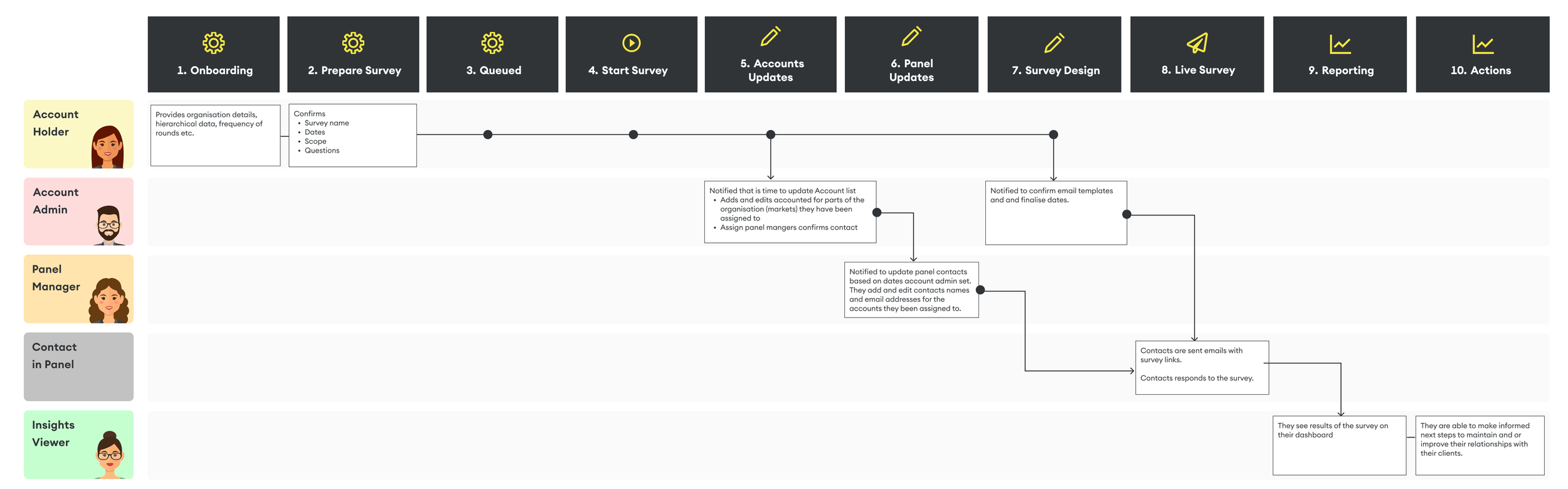 At the very beginning of my time at the company, I worked closely with our internal team to understand the entire process of running a survey from start to finish, at every level. This effort resulted in a detailed Service Blueprint.