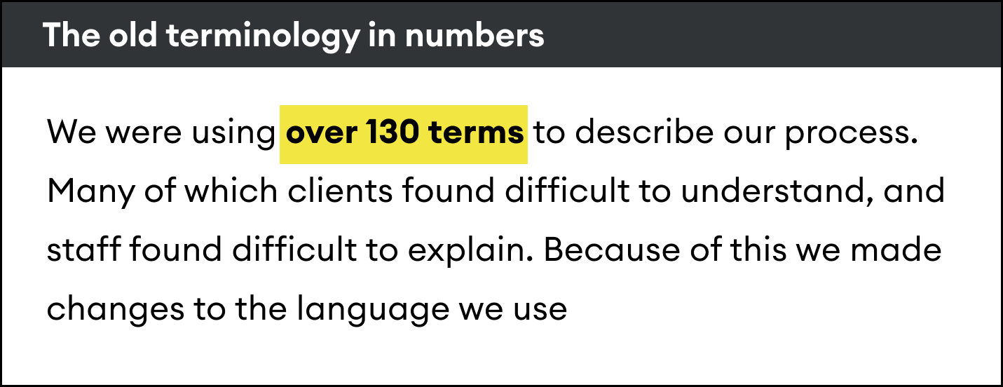 Challenge: Since there was no single, standardised way of doing things, multiple terms existed for the same concept, and stakeholders were passionate about the ones they used.