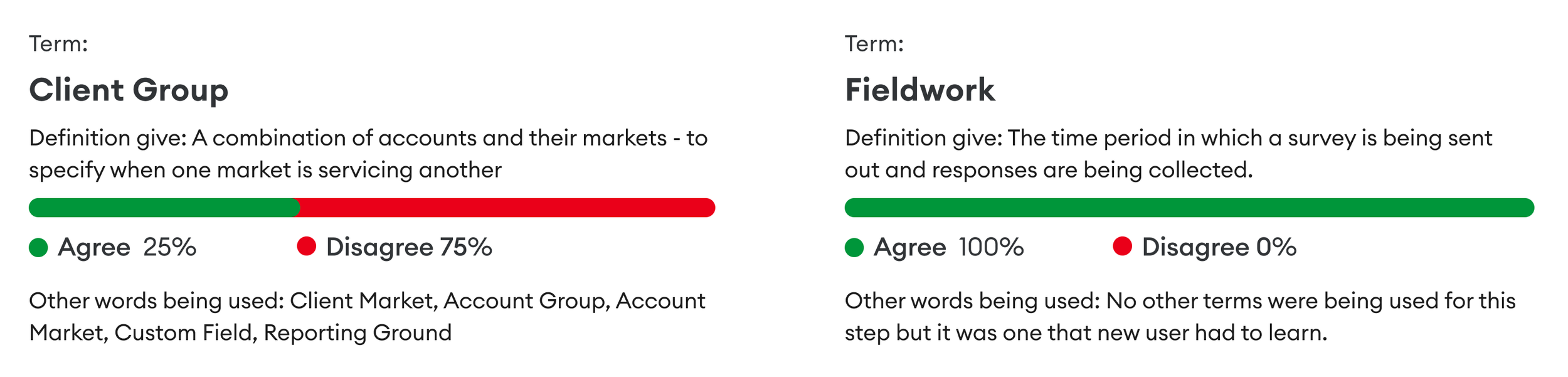 By presenting these results, it became easier to convey the problem. If we couldn’t define these terms internally, how could we expect our users to? Most of these terms were only being used internally, but as we transitioned to a client-facing platform, this needed to change.