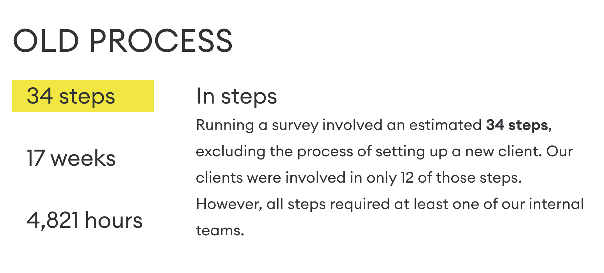 Although clients benefited from our service, producing it required significant time and manual effort. We began to struggle to meet deadlines and even had to temporarily halt new business.