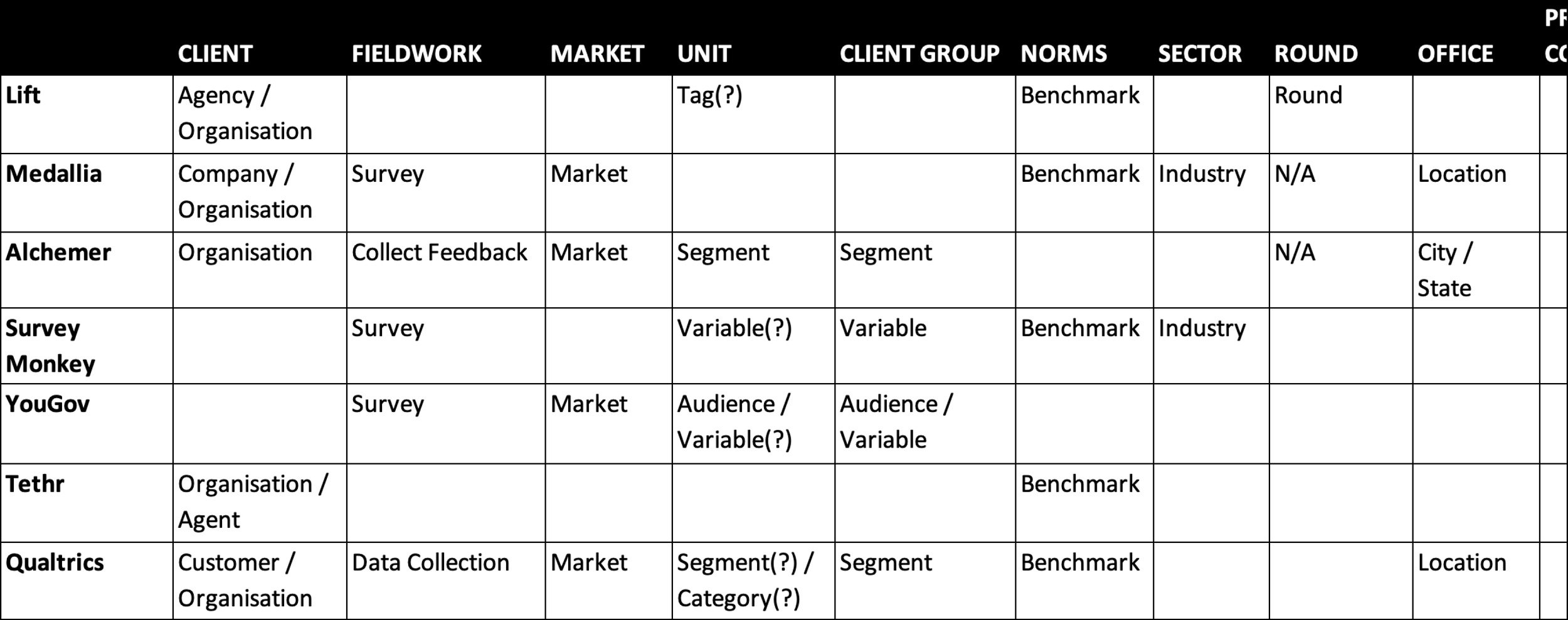 Next, we examined how our competitors labelled similar concepts. We also looked at companies outside of our direct competition but who also distributed surveys.